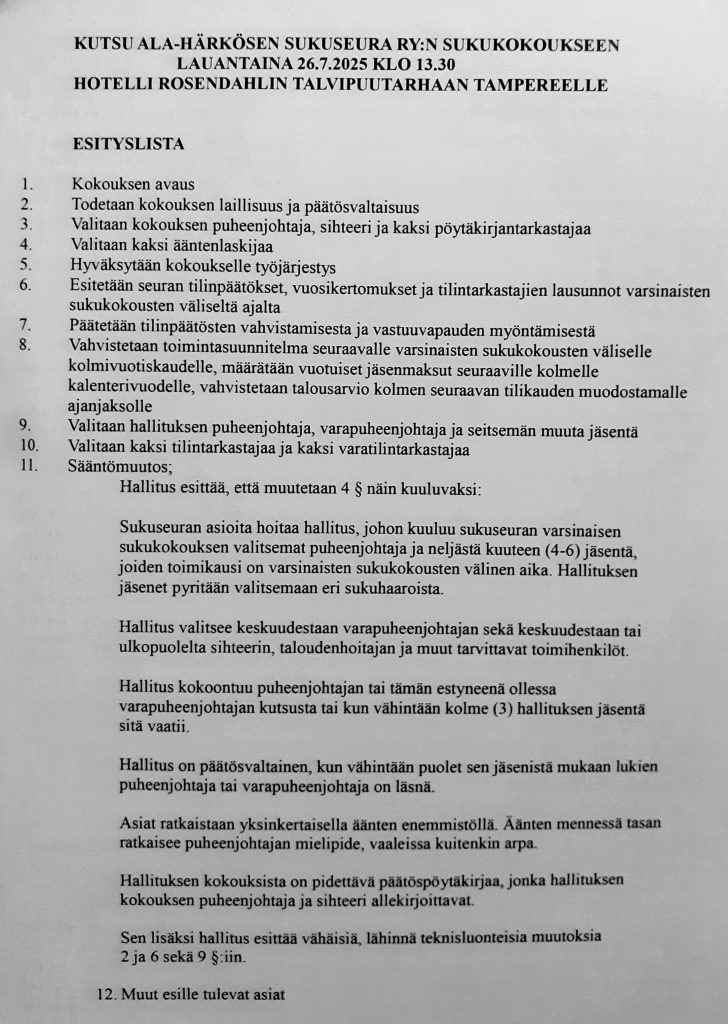 Sukukokouksessa 26.7.2025 käsiteltiin muutos yhdistyksen hallituksen jäsenmäärään. Hallitukseen valitaan vastaisuudessa puheenjohtaja ja kuusi muuta jäsentä. Varapuheenjohtaja valitaan hallituksen kokouksessa samoin kuin sihteeri. Sääntömuutos lähetetään yhdistysrekisteriin hyväksyttäväksi, jonka jälkeen se astuu voimaan. Seuraava kolmivuotiskausi edetään vanhalla säännöllä.